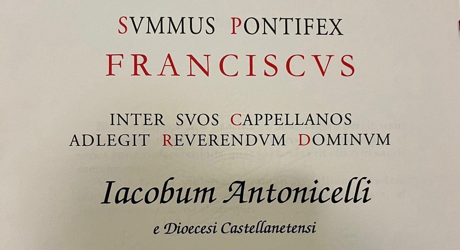 Con il biglietto della Segreteria di Stato del 27 marzo u.s., reso noto in data odierna, il Santo Padre Francesco ha annoverato tra i Cappellani di Sua Santità il Rev. Sac. Giacomo Antonicelli, presbitero della nostra Diocesi.