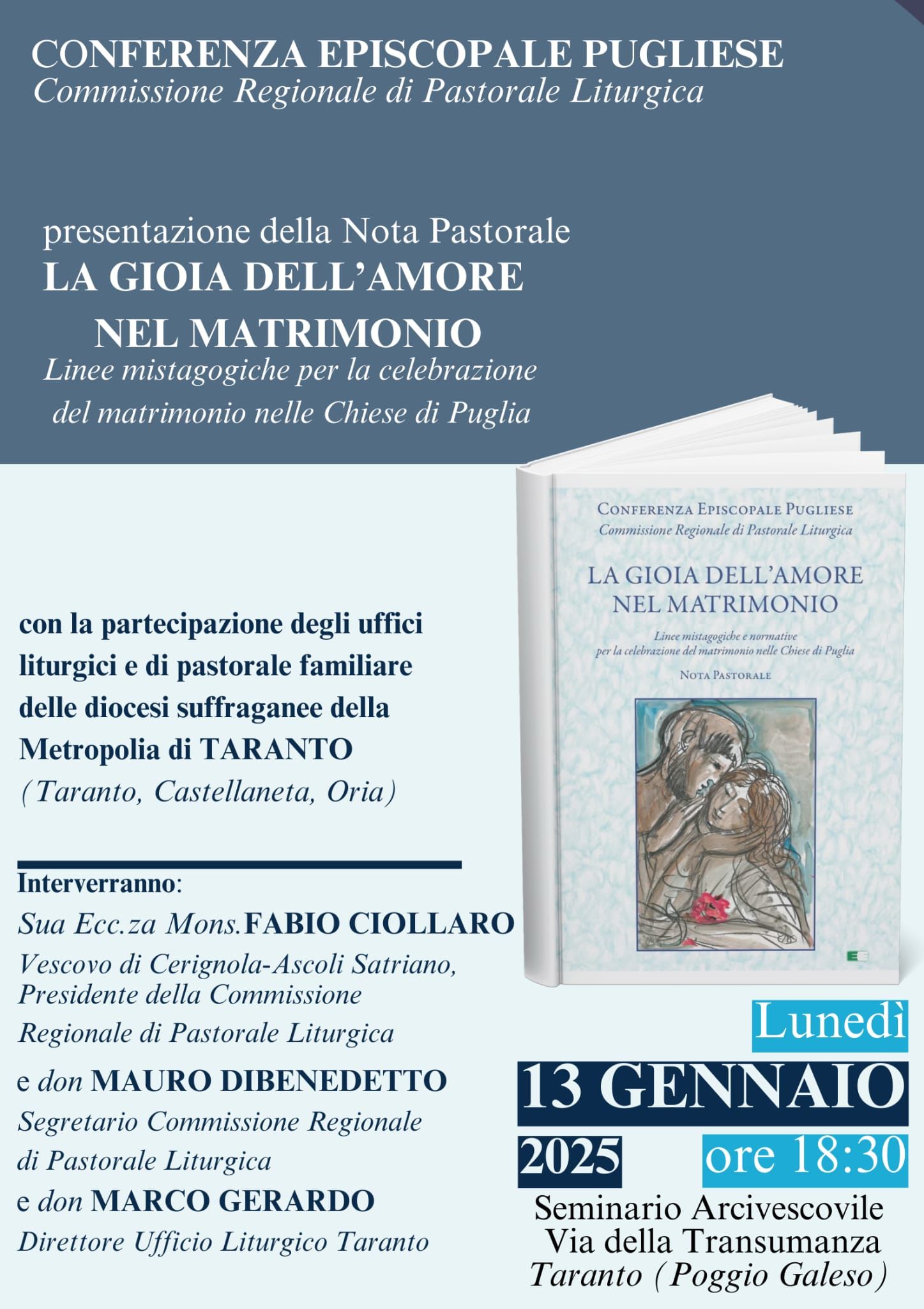 Lunedì 13 Gennaio 2025 alle ore 18:30 presso il Seminario Arcivescovile in Via della Transumanza a Taranto (Poggio Galeso), verrà presentata la Nota Pastorale a cura della Commissione Regionale di Pastorale Liturgica della Conferenza Episcopale Pugliese dal titolo “LA GIOIA DELL’AMORE NEL MATRIMONIO – Linee mistagogiche per la celebrazione del matrimonio nelle Chiese di Puglia”, con la partecipazione degli uffici liturgici e di pastorale familiare delle diocesi suffraganee della Metropolia di Taranto (Taranto, Castellaneta, Oria)
