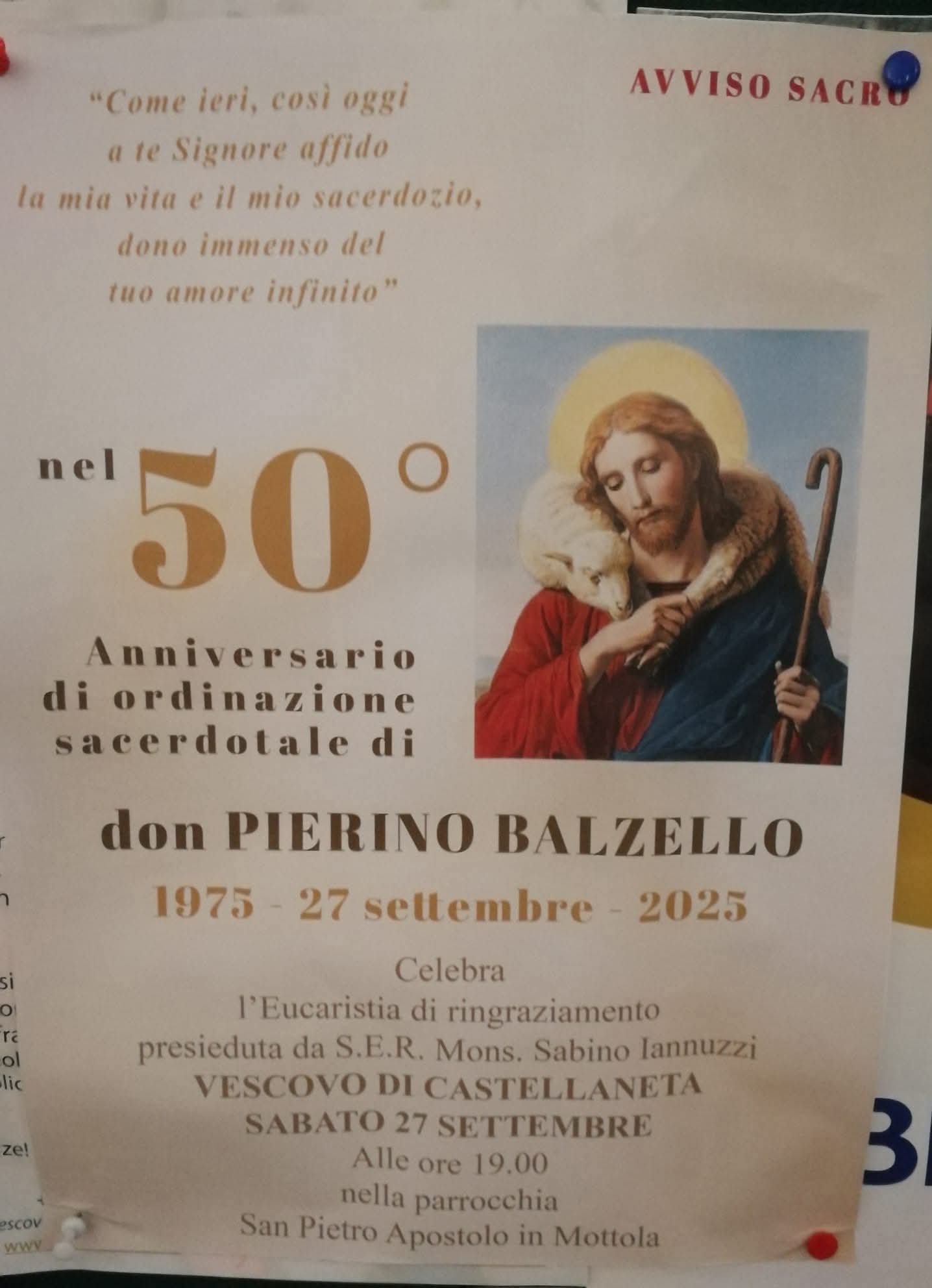 Sabato 27 Settembre 2025 alle ore 19:00 presso la Parrocchia San Pietro Apostolo di Mottola, Mons. Sabino Iannuzzi presiederà la Celebrazione Eucaristica in occasione del 50° anniversario di sacerdozio di don Pierino Balzello.